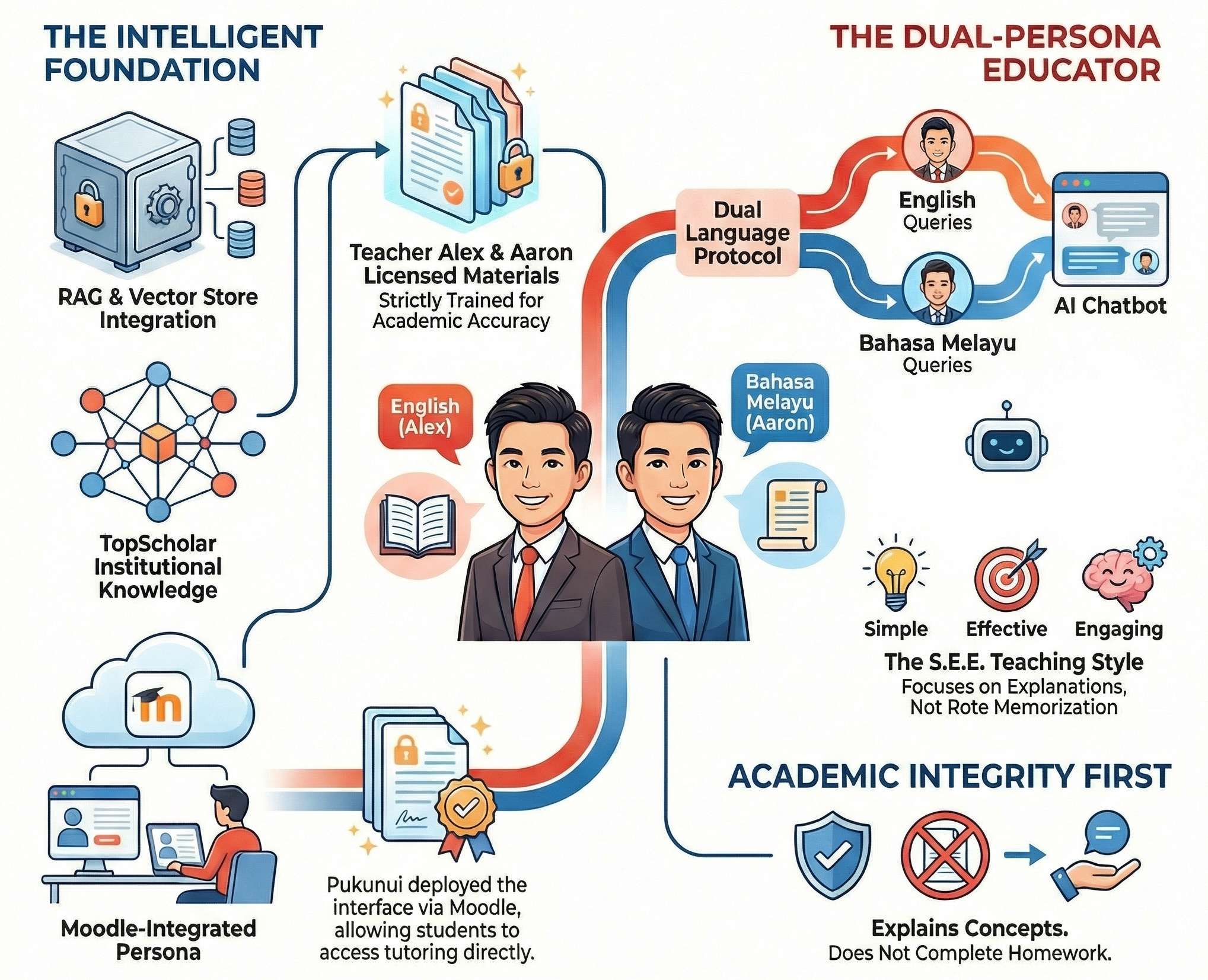 While generic AI tools like standard ChatGPT have captured global attention, the specific, nuanced requirements of a classroom environment—especially for students aged 13–17—demand a more tailored approach. Generic bots often lack the pedagogical boundaries and subject-specific expertise necessary for effective secondary education. TopScholar Education Group recognized this gap, envisioning a “Simple, Effective, and Engaging” (S.E.E.) approach to learning that moves away from the traditional “Memorise-to-Score” model. To translate this vision into a functional digital tool, Pukunui acted as the technical architect, building a custom Moodle-integrated AI reality that serves as a 24/7 personal tutor: 小AA助理 (Little AA Assistant).
